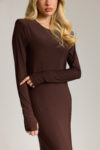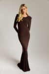 שמלת מקסי מבד לייקרה עם סיומת בד רזיל שקוף. סגירת רוכסן מאחור.